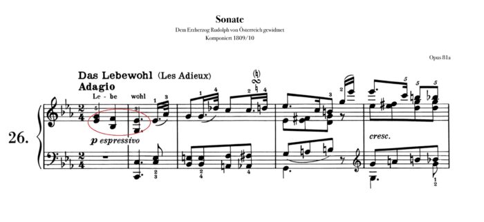 今回の手直しはかなり細かく、一つ一つの音作りを相当丁寧にやり直しました。それぞれの音の繋がりに意味がちゃんとあるんだからというのが我が師の教えです。特に冒頭のベートーベン自身の書き込みによる、Le – be – wohl(ドイツ語で「さよなら」「別れ」を意味する)が、ソ – ファ – ミ♭ と ミ♭- シ♭ – ソの下降する音型の三つの和音の上に「歌詞のよう」に書かれているところがなかなかOKが出ませんでした。この曲の核となる音型だそうです。自筆譜には、Le(汝よ)be(あるように) wohl(しあわせで、無事に)という音節ごとにハイフンで分割して書いてあります。 それぞれ感情を強調するためにそうしたんだろうと言われております。でもどういうわけか使っているHenle版では以下のような表記になってます。