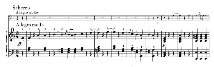 一番難渋したのは第二楽章のスケルツォでした。 三拍子ですが、三拍目と次の一拍目をタイで結ぶ音が多用されてます。 以下出だしの楽譜を参照してください。