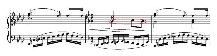 そういった中で、ピアノを弾く技術の面では声部の処理について我が師匠が傑作のコメントをしてくれましたので紹介しておきましょう。 例えば、第一楽章、47小節について、