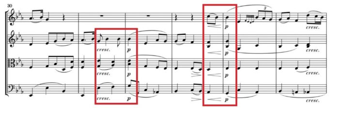そして、大変美しい曲なんですが、只美しいだけでなく、曲の中程でハッとする凄みが出てきます。 曲の中程で出てくる”beklemmt(息も絶え絶えに. 不安な. 胸苦しい)”の指示です。 第二バイオリン、ビオラとチェロがppの6連符+3連符のセミレガートで支えている中で第一バイオリンが静寂の中、我が胸の内を語りかけるように歌い上げる部分ですね。