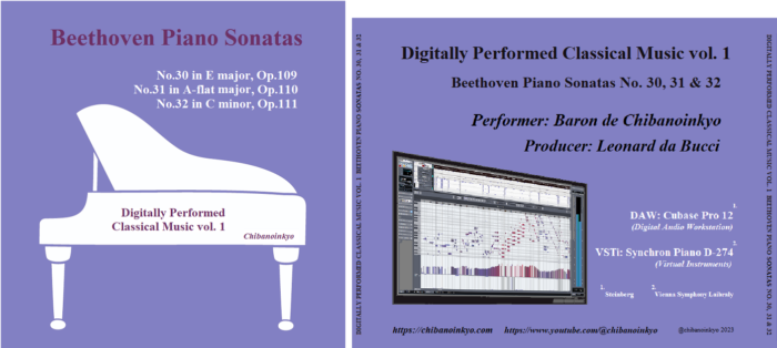 ベートーベンのピアノソナタは全部で32番までありますが、特に後期三曲、30番・31番・32番は聴けば聴くほど深みのある趣を感じます。 たまたまドイツの古き友人と再会することになり、自分で打ち込んだこの三曲を聴いてもらおうと纏めてCD化することにしました。 そこで再度我が師に聴いてもらい、随分と修正を重ねました。 時間をおくとブラッシュアップポイントがまた見えてくるもんなんですね。 三曲一時間ちょっとでしたのでwavファイルをそのままCDに焼き付けることにしました。 下記画像はついでに作ったジャケットデザインです。