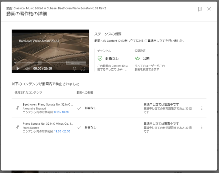 Beethoven Piano Sonata No.32 Rev2.をYouTubeに上げたら直ぐに以下のContent IDの申し立てがなされました。 多分自動的にサーチングしてるんでしょうね。