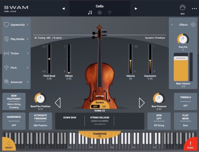 最近話題に上がってきているSWAMというAudio Modering社の物理モデル音源SWAM-S(チェロ)を入手し、チェロの小品を課題にして研究しています。