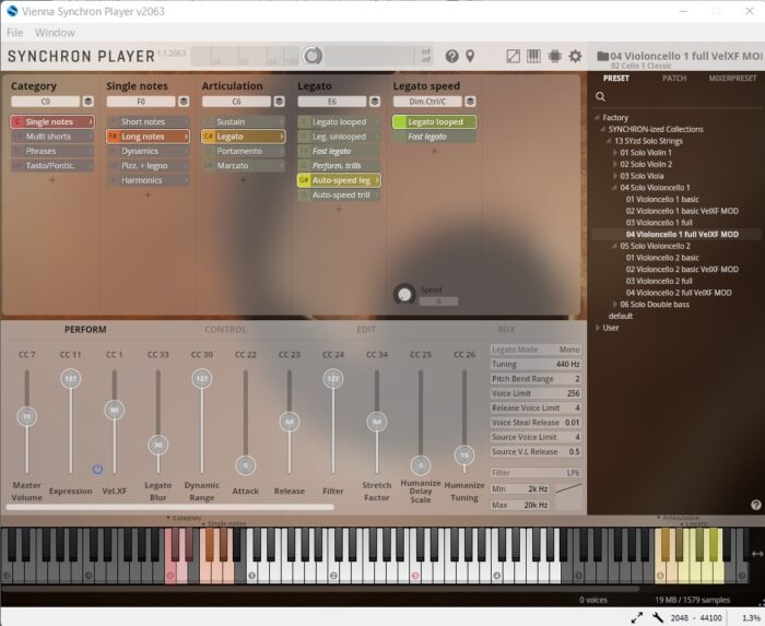ところがSWAM-Sはその容量が数10MBで済んでしまうごく小さなプログラムです。 ただ、容量は小さいんですが、PCリソースは大分使うようです。 全ての音をコンピューターで計算して発音しているからなんでしょう。 つまり、生チェロを弾く状態をモデリングしているわけですから「物理モデル」というわけです。 かなり細かなパラメターの設定が必要になります。 下げ弓、上げ弓、弓位置、弓圧、ビブラートの深さ、振動数、アタック・・・、普段弾いているときにはさほど気にしていない振る舞いを、全てパラメータ化してインプットしなくてなりません。 そうでないと、只の単調な音程の変化だけになってしまいます。 ですから普段生の楽器を触ってないとなかなか分かりづらいと思います。(多分押さえどころがあるんだと思いますが)