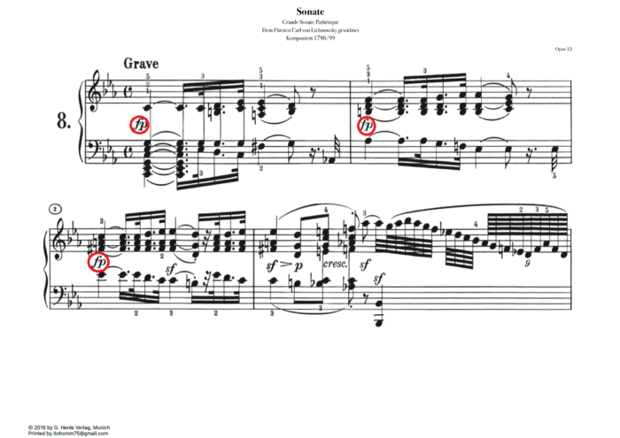 実はベートーベンのピアノソナタ8番「悲愴」を打ち込んでいてなかなか上手くいかなかったとろがあります。 それが冒頭の和音から続いて出てくる「fp」の処理についてです。