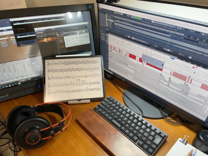 DTMをどんな仕組みで進めているかのメモです。右のディスプレイはDAW(ピアノロール)で演奏データを入力。左のディスプレイでピアノや弦など各音源の音質を調整。iPad Proは楽譜表示とメモ。ヘッドホンで確認しつつ、キーボードは使わずマウスでのんびり入力しています。